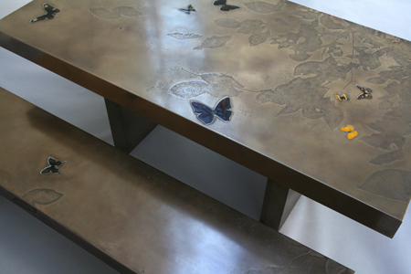 Если вас не пугает происхождения материала для стола, он может послужить отличным украшением сада. Создан от именно для улицы – поэтому такой грубый, несмотря на бабочек, дизайн, и материал его стойко переносит и зной, и холод, и солнце, и дождь. Кто знает, может, он привлечет множество живых бабочек. А жить по соседству с бабочками – очень приятно
